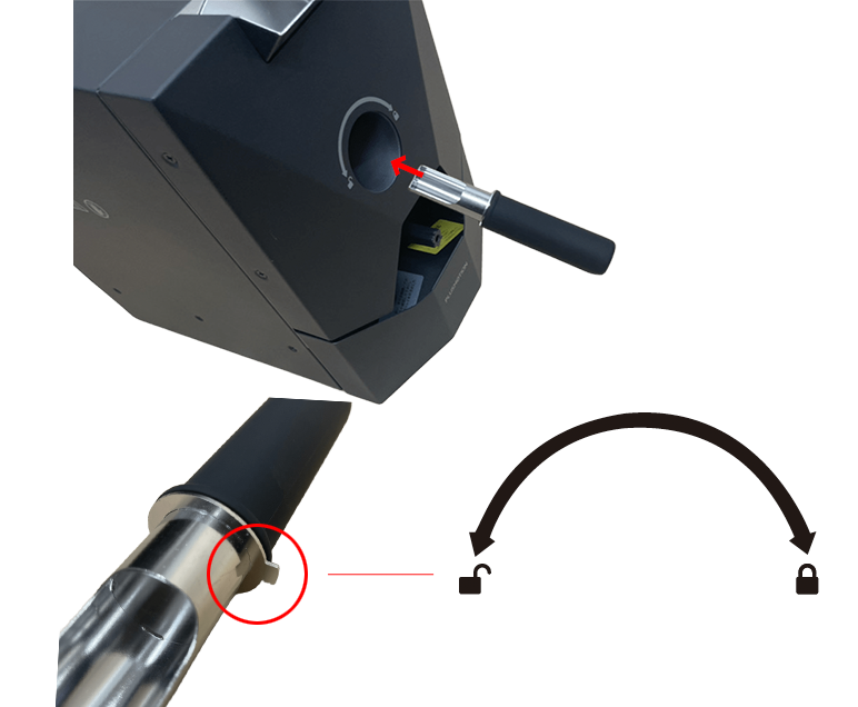 - サンプルスプーンを突起がロック解除マークを指すように挿入し、サンプルスプーンをロック施錠マーク方向に回転させてロックします。